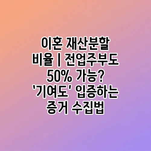 이혼은 인생에서 매우 힘든 과정입니다. 특히 재산분할 문제는 많은 분들이 고민하는 부분 중 하나입니다. 특히 전업주부의 경우, 경제적 기여도가 명확하지 않아 재산분할 비율에 대해 불안감을 느낄 수 있습니다. 이 글에서는 이혼 재산분할에 대한 기본 개념과 함께, 전업주부가 어떻게 50%의 기여도를 입증할 수 있는지, 그리고 필요한 증거를 어떻게 수집해야 하는지를 자세히 설명하겠습니다. 이를 통해 여러분이 자신의 권리를 확실히 이해하고 준비하는 데 도움이 되길 바랍니다.
